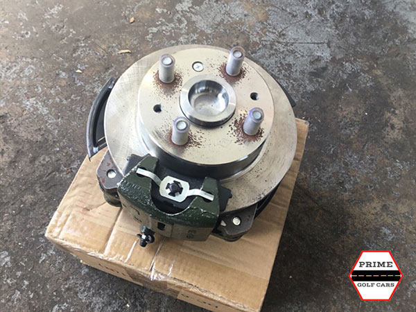 New front disc brake assembly for ACG or America EV golf cart – California Roadster, 39 Roadster, etc. Left driver side. Complete with disc, caliper, and brake pads.